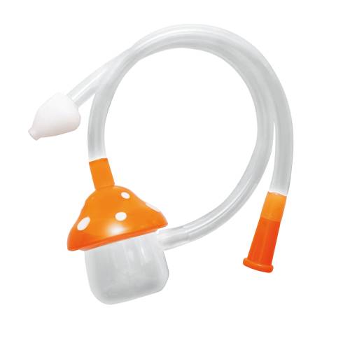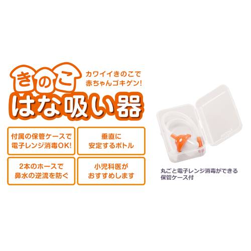 2本のホースで鼻水の逆流を防ぐ。かわいいきのこで赤ちゃんゴキゲン! 「きのこはな吸い器」