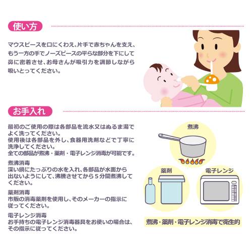 ■使用方法:マウスピースを口にくわえ、片手で赤ちゃんを支え、もう一方の手でノーズピースの平らな部分を下にして鼻に密着させ、お母さんが吸引力を調節しながら吸いとってください。