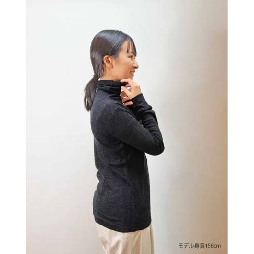 1枚でも、冬の暖かいインナーとしても活躍するトップス、ボトルネックが首元を暖かくカバーします。