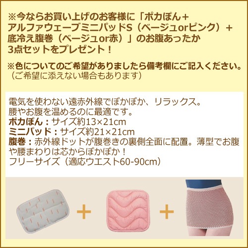「ポカぽん+アルファウェーブ・ミニパッドS(ベージュ or ピンク)+底冷え腹巻(ベージュ or 赤)」