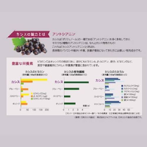 カシスにはポリフェノールが多く含まれており、なかでもブルーベリーないカシス特有の2種類のアントシアニンを含有しています。
