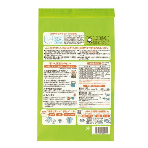 添加剤を含まない無添加石けんなので、木綿・化繊・麻から、ウール(毛)やシルク(絹)といったおしゃれ着洗いにもご使用いただけます。