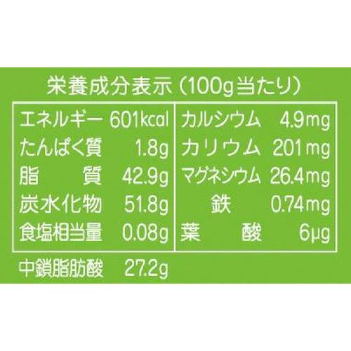 すばやくエネルギーに変わる中鎖脂肪酸が約27%含まれます。母乳にも含まれるラウリン酸もたっぷり。良質なエネルギー補給として、コーヒーやスムージーなどのドリンクに加えても美味しく召し上がって頂けます。