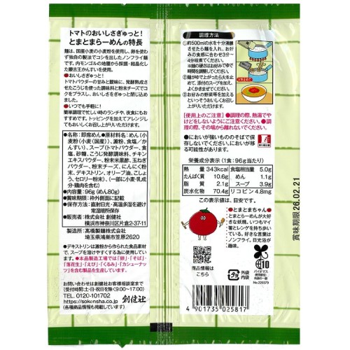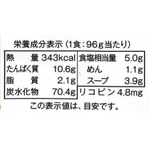 ■原材料:めん(小麦粉(小麦(北海道))、澱粉(馬鈴薯(北海道))、食塩(香川)/かんすい(中国内モンゴル))、スープ(トマトパウダー(ポルトガル)、食塩(メキシコ、オーストラリア)、砂糖(国産)、こうじ発酵調味料(国産他海外)、チキンエキスパウダー(フランス他海外)、粉末米黒酢(国産)、デキストリン(キャッサバ(タイ他海外))、玉ねぎパウダー(中国他海外)、にんにく粉末(中国)、粉末チーズ(デンマーク等EU域内)、オリーブオイル(チュニジア、スペイン)、こしょう(ベトナム他海外)、セロリー粉末(インド他海外)、(一部に小麦・乳成分・鶏肉を含む)