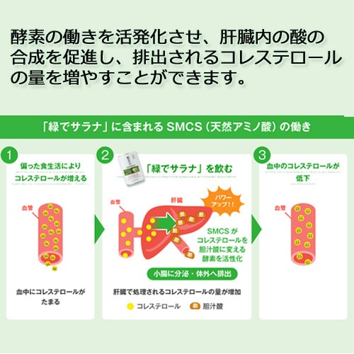 コレステロールは、肝臓で「酵素」によって胆汁酸に変化し、体外に排出することができます。 より多く排出されることでコレステロールを下げることができるのですが、SMCS(天然アミノ酸)にはその酵素の働きを活性化させる働きがあり、肝臓における胆汁酸の合成を促進し、排出されるコレステロールの量を増やすことができるのです。 ※SMCS(天然アミノ酸)はブロッコリーやキャベツなどのアブラナ科野菜に多く含まれる成分です。