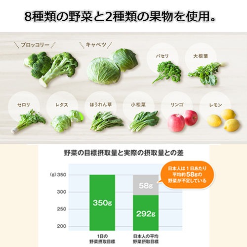 ■原材料:ブロッコリー(米国・メキシコ産)、セロリ(日本・メキシコ産)、キャベツ(米国・メキシコ産)レタス(国内産)、ほうれん草(国内・欧州産)、大根葉・小松菜・パセリ(国内産)、りんご(国内・欧州産)、レモン(イスラエル産)、クチナシ色素、ビタミンC、カロテン色素