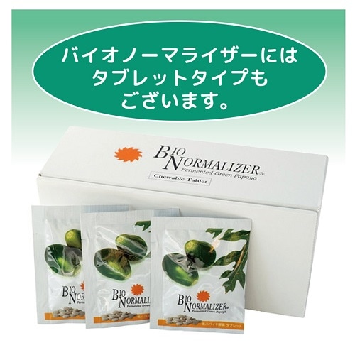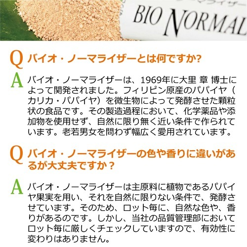 A:バイオ・ノーマライザーは、1969年に大里 章 博士によって関発されました。フィリピン原産のパパイヤ(カリカ・パパイヤ)を微生物によって発酵させた顆粒状の食品です。その製造過程において、化学薬品や添加物を使用せず、自然に限り無く近い条件で作られています。老若男女を問わず幅広く愛用されています。